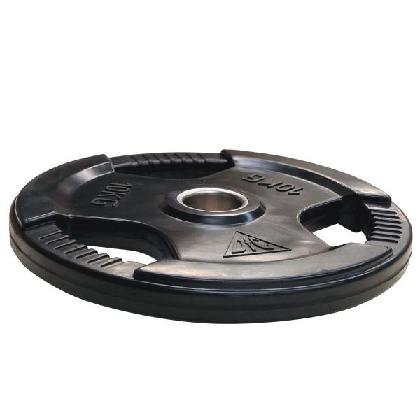 Диск обрезиненный с хватом DFC. Цвет чёрный. Металлическая втулка. Посадочный диаметр 51 мм. Вес диска 10 кг.Удобная форма диска с тремя ручками для хвата с разной стороны.