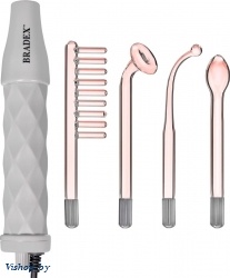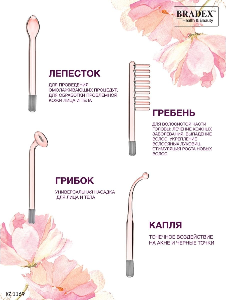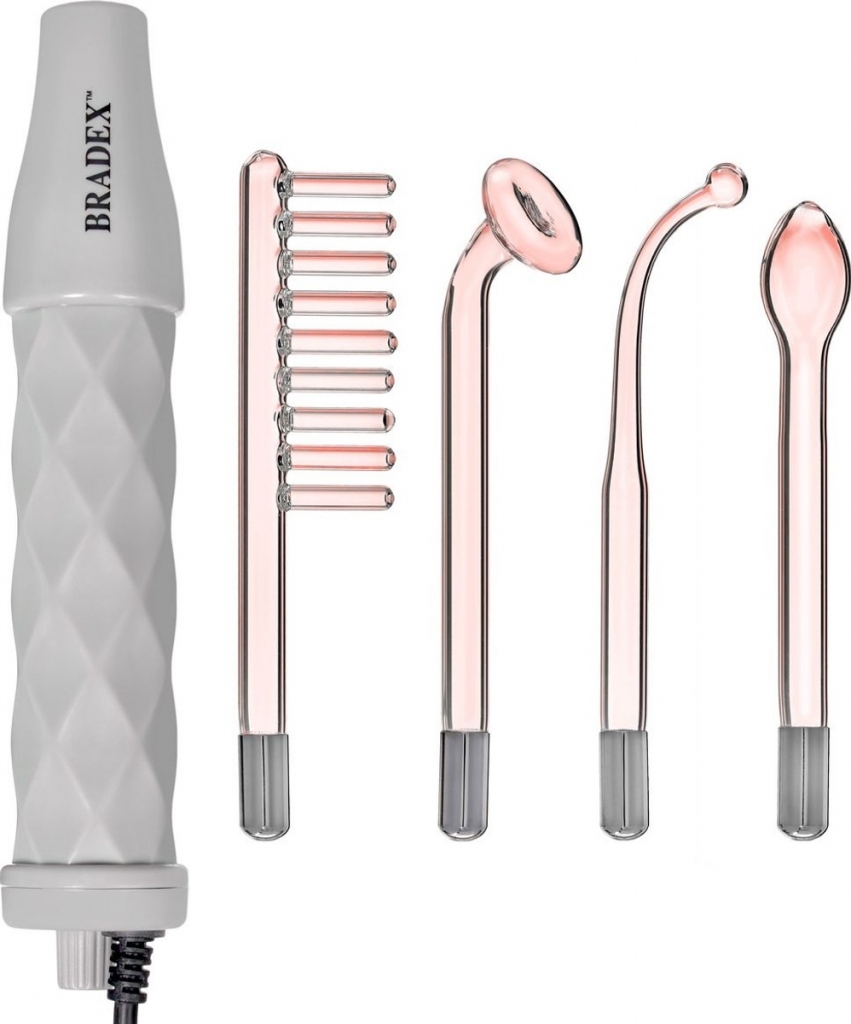 В комплекте предусмотрен встроенный стабилизатор напряжения и 4 вида насадок-электродов для устройства: насадка-электрод эллиптической формы, насадка-электрод для точечного воздействия, универсальная насадка-электрод и электрод-расческа.