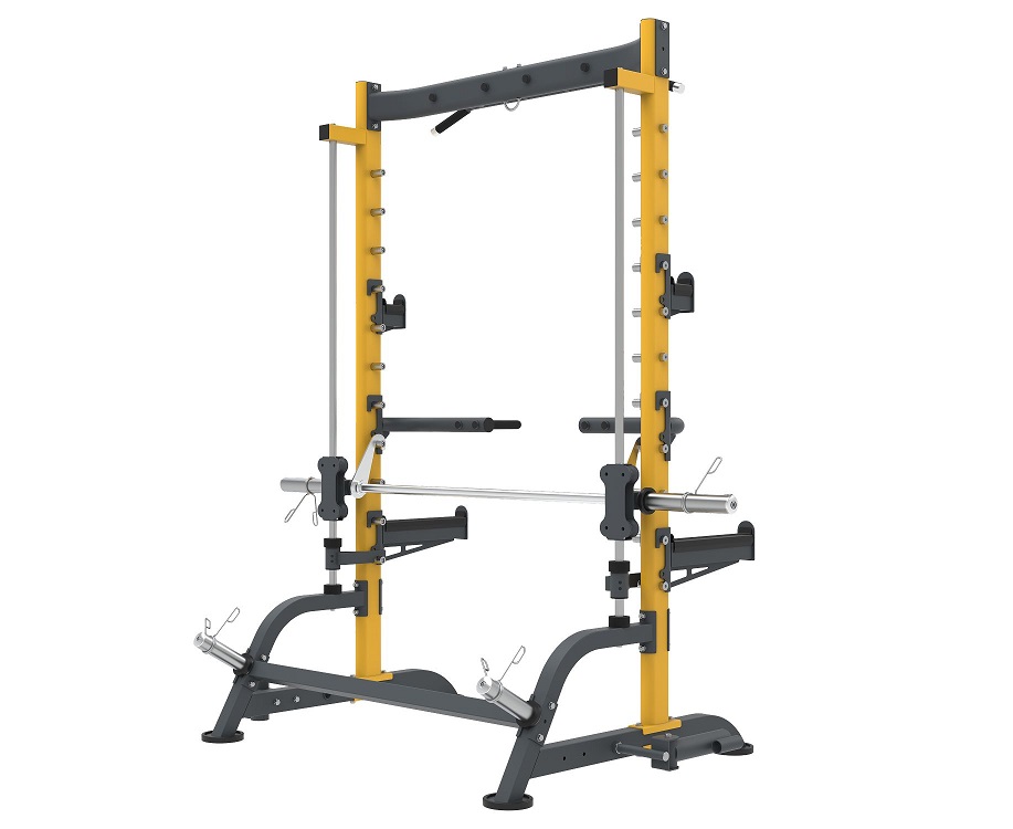 Машина Смита представляет собой силовой тренажёр с прочной стальной рамой, выполненной в жёлто-чёрной цветовой гамме. Конструкция имеет устойчивую П-образную форму и оснащена двумя основными вертикальными направляющими, по которым перемещается фиксированный гриф. По всей высоте стоек расположено множество уровней фиксации, позволяющих точно настраивать рабочую высоту штанги под различные упражнения и рост пользователя.