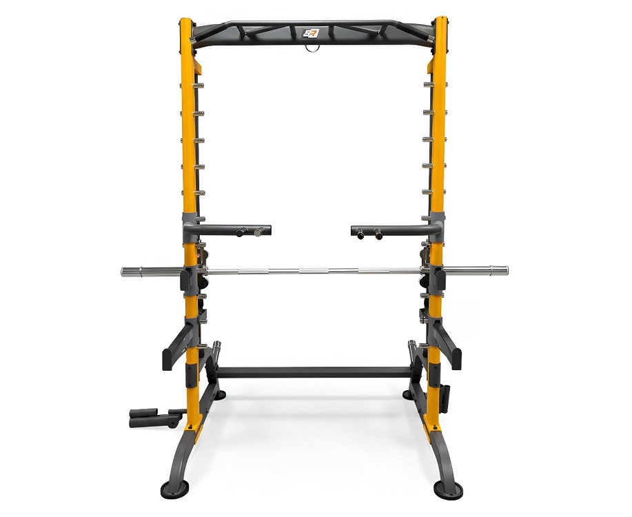 Тренажёр оборудован грифом для приседаний, который движется строго по заданной траектории и фиксируется с помощью ограничительных кронштейнов безопасности, размещённых сверху вниз на стойках. Это обеспечивает дополнительную защиту при выполнении упражнений со свободными весами. Конструкция также дополнена боковыми упорами и держателями, расширяющими функциональные возможности тренажёра.