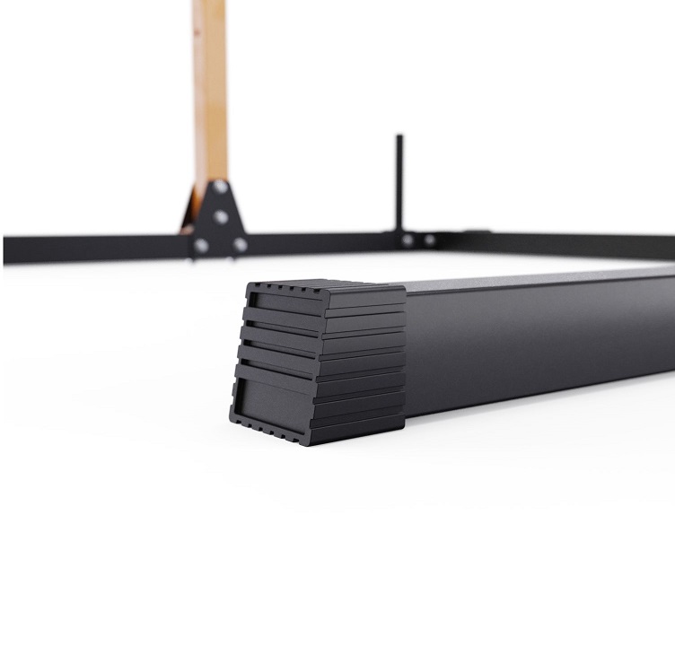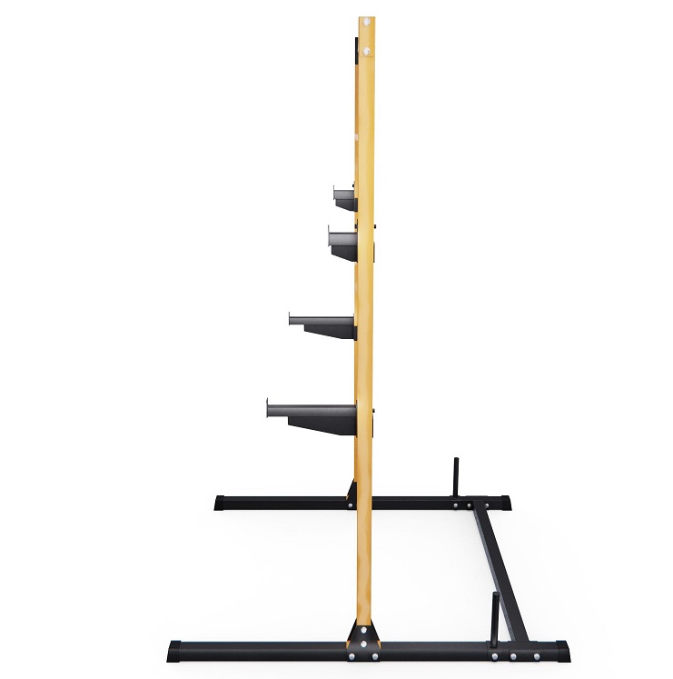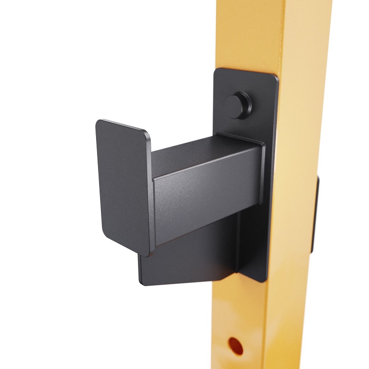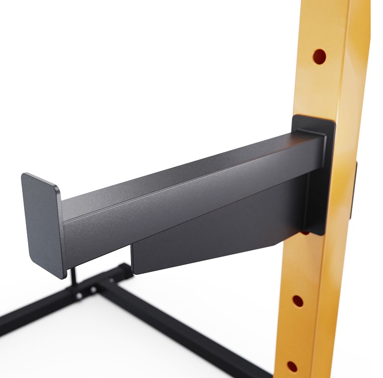 2 пары держателей для штанги регулируются на 21 уровень по высоте с шагом 8 см. Для хранения дисков предусмотрены 2 держателя по углам тренажера длиной 20 см (Ø25 мм). Нескользящие ножки надежно устанавливаются на полу и не царапают поверхность.