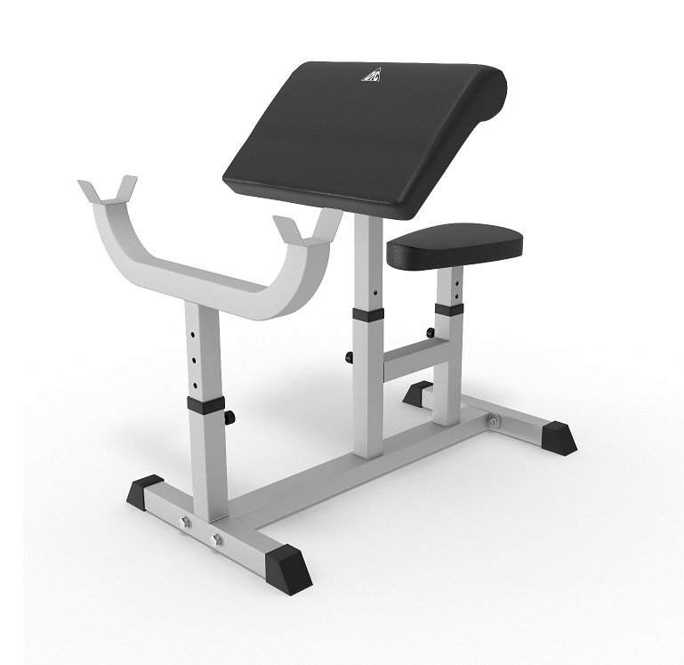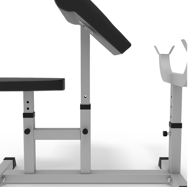Сиденье, парта для бицепса и стойки под штангу регулируются по высоте.