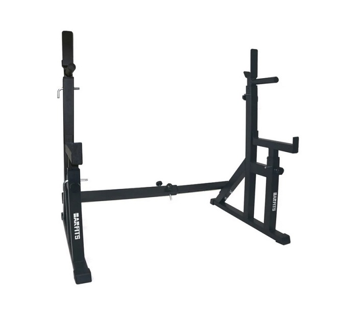 Задняя сторона стойки оборудована миниатюрными брусьями. Брусья рассчитаны на нагрузку до 130 кг. Благодаря возможности регулировки стойки по ширине и высоте вы легко настроите брусья под собственный рост и нужную вам ширину хвата. Стойка позволяет отжиматься как широким, так и узким хватом.Так же на задней стороне стойки имеются штыри для весовых дисков для штанги. С одной стороны, тренировочное пространство выглядит более опрятным, с другой – половое покрытия находится в большей безопасности, ведь вам не нужно класть тяжелые металлические диски на пол.
