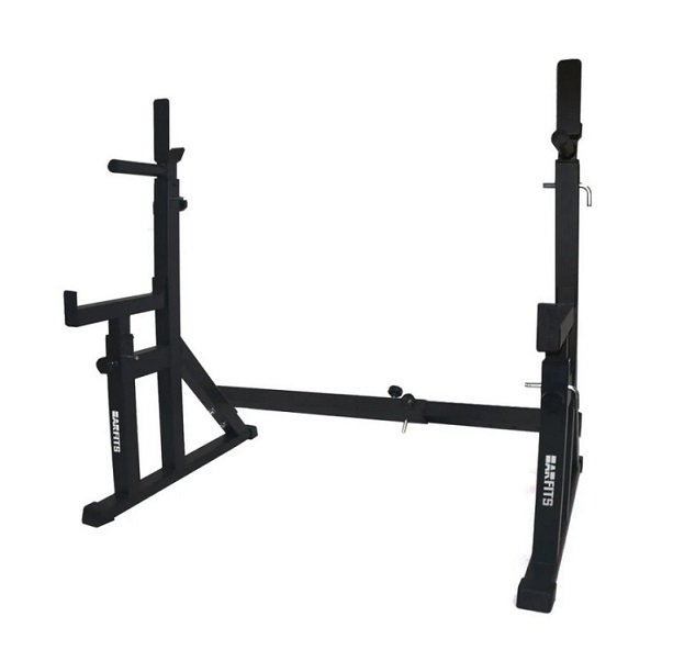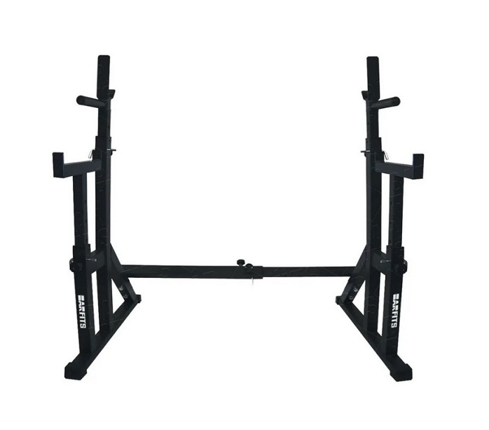 Так же просто стойка регулируется по ширине. Это позволяет использовать гриф практически любой длины (максимальное расстояние между стойками 136 см). Однако, в зависимости от вашего роста и длины ваших рук, страховочные упоры могут немного мешать в локтях при занятиях со слишком коротким грифом. Если вы привыкли тренироваться с грифом короче 180 см, лучше воспользоваться стойкой «Central Sport» без страховочных упоров, правда, тогда вам понадобится помощь страхующего.