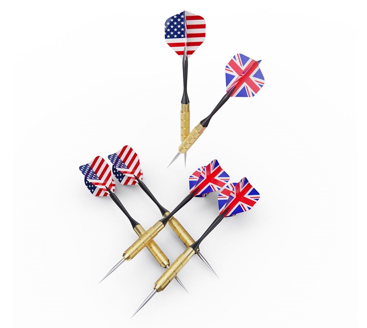 Комплект мишени включает в себя 6 дротиков с металлическими наконечниками и имеет 2 разные мишени с двух сторон. Кроме того, в комплекте идут флайты с американским и английским флагами, что делает эту мишень еще более интересной. Диаметр мишени составляет 43 см.