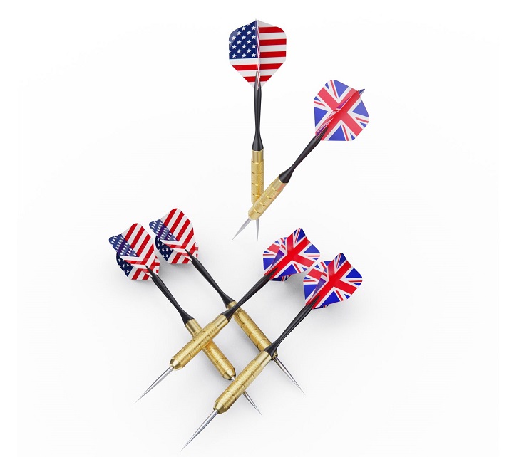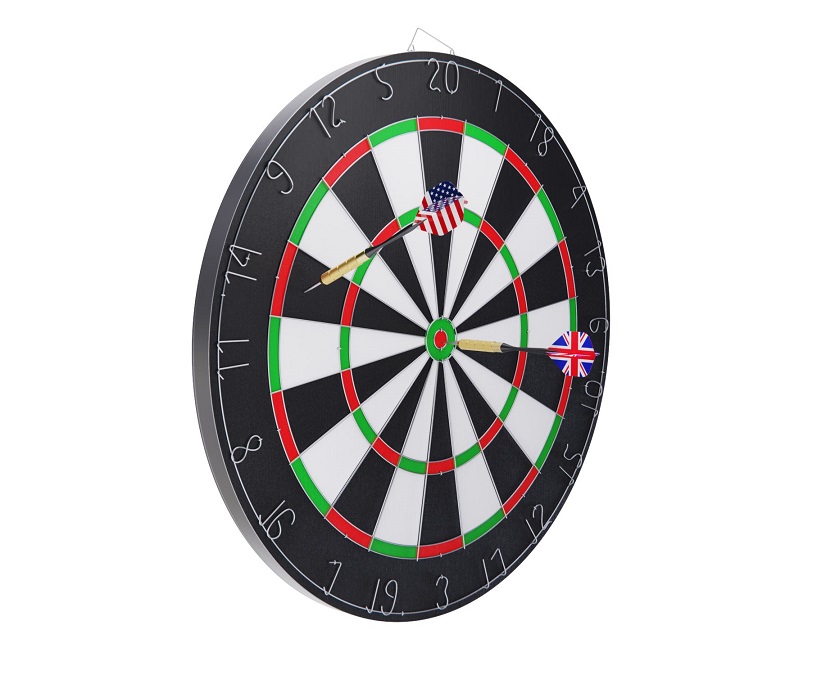 Комплект мишени включает в себя 6 дротиков с металлическими наконечниками, а также имеет 2 игровых поля с двух сторон для разных типов игры. Каждый дротик весит 16,5 грамм, что делает его легким и удобным для бросков. Кроме того, в комплекте идут флайты с американским и английским флагами, что делает эту мишень еще более интересной. Диаметр мишени составляет 45 см.