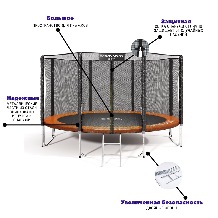 - Высокая защитная сетка – также важное условие для безопасности батута. Сеть Atlas Sport выполнена из высококачественного нейлона, в меру эластична и обладает амортизирующими свойствами. Ширина каждой ячейки подобрана таким образом, чтобы даже самые маленькие пальчики не могли застрять в ней. Вход/выход через сетку выполнен на молнии с 4-мя фиксирующими защелками на внешней стороне сетки для защиты от случайного открытия.