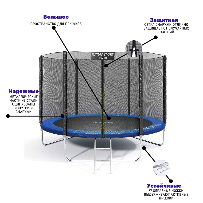Батут Atlas Sport 252 см отлично подходит для развлечения и приятного занятия спортом детей и взрослых. В комплекте сразу идет безопасная сетка, которая удерживает прыгунов на батуте, защищая от травм, а так же лестница от земли до пружинящей поверхности. Батут Atlas Sport 252см легко устанавливается на любой подходящей по размерам горизонтальной площадке. Прыгать – это здорово. А прыгать на батуте – это здорово вдвойне, потому что на нём прыгать, скакать и кувыркаться в отличие от мягкой мебели стоящей в доме не просто можно, но и нужно. При этом защитная сетка делает использование батута совершенно безопасным. А кроме удовольствия батут приносит и ощутимую пользу здоровью, потому что во время прыжков активно задействуются икроножные мышцы, мышцы бёдер и спины. Поэтому купить батут – это значит купить и спортивный тренажёр на детскую площадку, заниматься на котором чрезвычайно легко и приятно.