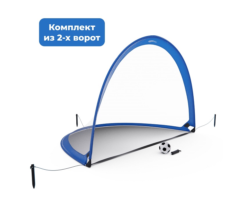 В комплект входят 2 полноразмерных складных ворот (размер в рабочем виде — 123 х 77 х 79 см), мяч, насос, чехол для хранения и анкеры для крепления в грунт. Это делает ворота полностью автономным решением для быстрого старта игры. Складная конструкция позволяет быстро свернуть ворота и поместить их в удобный чехол. Лёгкий вес и простота сборки делают комплект отличным спутником на даче, пикнике или отдыхе у моря.