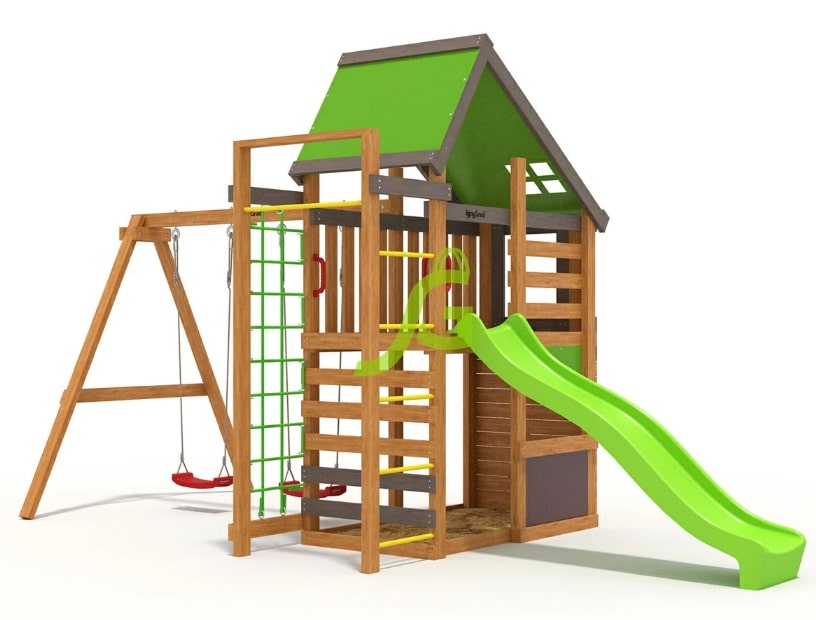 Основание площадки выполнено из бруса камерной сушки 45х90 мм. Игровой домик рассчитан для малышей от 3-х лет и детей постарше. Углы деревянных элементов сглажены. Крепежные элементы утопают внутрь, чтобы их шляпки не повредили нежную кожу малышей. Современный пластик, применяемый для спортивно-игрового комплекса износостойкий. Декоративные элементы выполнены из армированной тентовой ткани ПВХ. Она не выцветает на солнце, выдерживает высокие и низкие температуры, защищает от влаги.