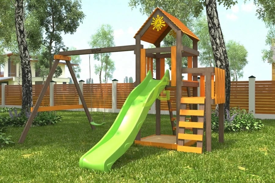 - Качельный модуль, размещающийся на достаточно безопасном расстоянии от домика.