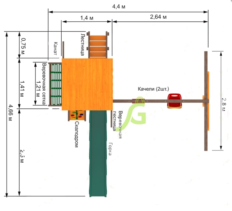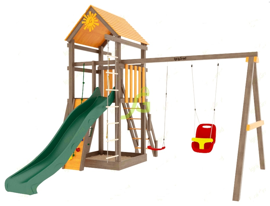 По желанию клиента игровая площадка может быть укомплектована дополнительными элементами. Можно заменить обычные качели на качели-гнездо, которые очень удобны в использовании. Наши специалисты обсудят с вами все детали заказа и быстро оформят заявку.Обращаем Ваше внимание, что цвет установленной детской площадки может отличаться от представленных изображений на сайте. Специфика окраски нетоксичными пропитками допускает отклонения в цветовой гамме отгружаемых изделий вследствие различного цвета натурального природного сырья и естественных компонентов, используемых для производства площадок.