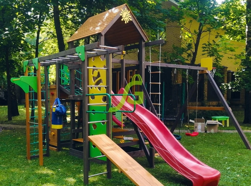 - Не нагревается на солнце и не остывает при низкой температуре. Поэтому ребёнок может спокойно играть на деревянной площадке в любое время года.