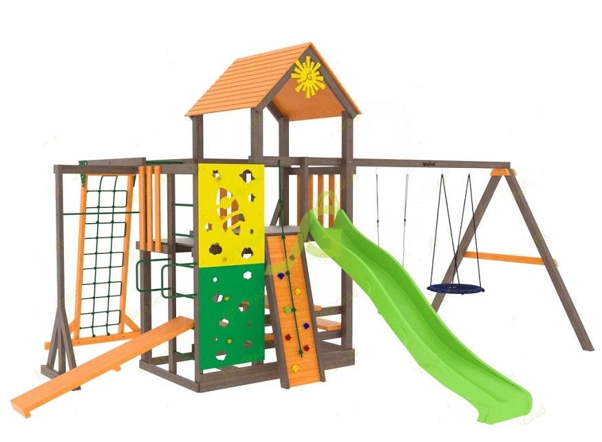 Дети проявляют интерес ко всему, что находится рядом с ними. В них полно энергии, они стремятся каждый день открывать для себя что-то новое. Эту неуёмную энергию необходимо направлять в нужное русло, оптимальный вариант – спорт. Детская площадка IgraGrad Спорт 4, разработанная специально для детей разного возраста, привьёт любовь к спортивным занятиям на свежем воздухе!Конструкция спроектирована так, чтобы она проявляла к себе интерес. Поэтому данная детская площадка – не просто набор игровых элементов, а грамотно продуманное сооружение в виде башни с крышей, органично укомплектованной модулями для активных занятий. Здесь присутствуют удобные качели, рукоход, турник, волновая горка с бортами из прочного пластика, скалодром с канатом, лестницы, баскетбольное кольцо – всё, что требуется для развития мышц, тренировки выносливости, укрепления иммунной системы.