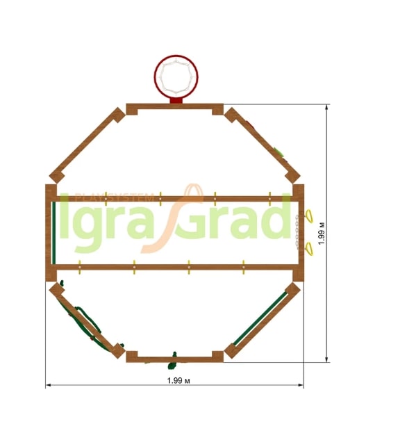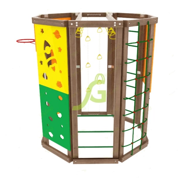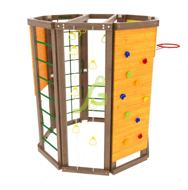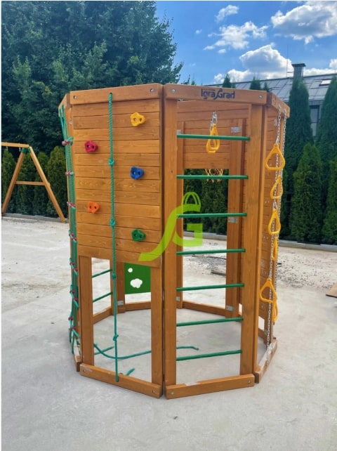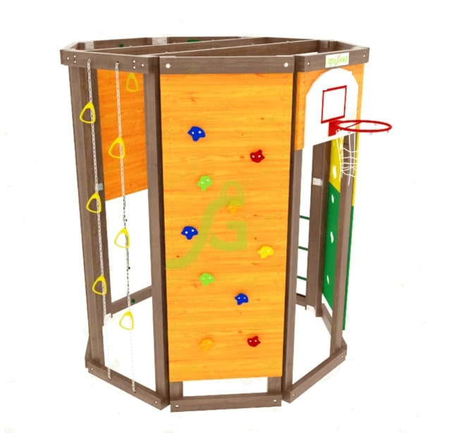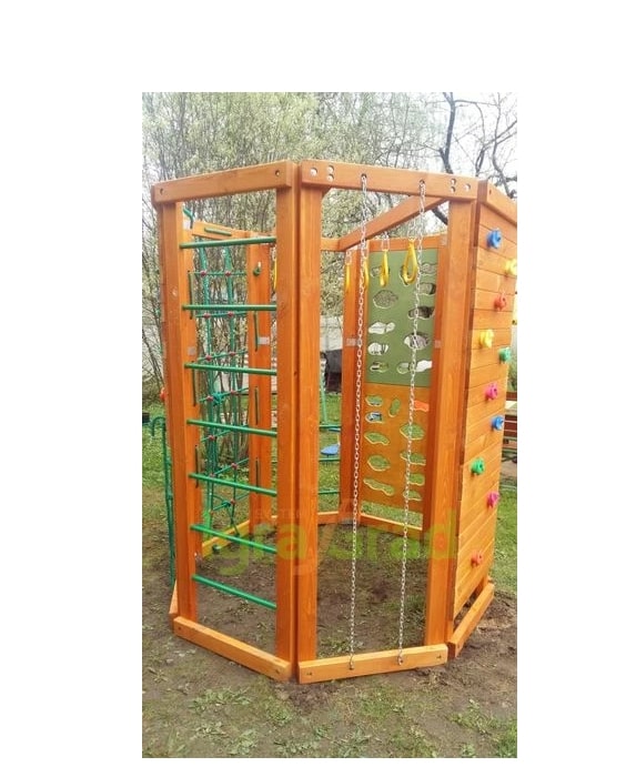 Если отсутствует каждодневная возможность водить ребёнка на спортивные секции, то идеальным вариантом будет купить спортивный комплекс IgraGrad "WorkOut" для обустройства игровой зоны на дачном участке.Конструкция выполнена в виде многогранника, каждая стенка которого оборудована различными спортивно-игровыми элементами: «обезьяньей пропой», скалодромом, верёвочной лестницей, баскетбольным кольцом. Высота сооружения достигает 2,29 м, а ширина 1,99 м – оптимальные размеры для занятий двух-трёх человек..