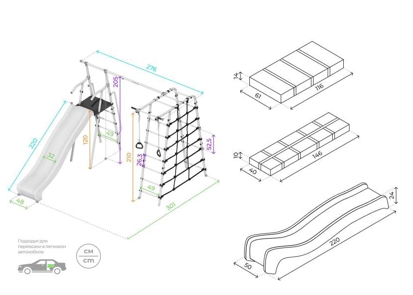 Все навесное оборудование выполнено из атмосферостойких материалов — в летнее время их можно не убирать в дом после занятий. Приключения обещают быть захватывающими!