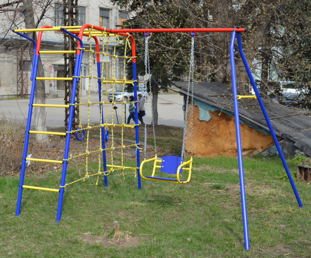 ДСК Юла — идеальное решение при выборе универсального спортивного комплекса, металлическая конструкция которого позволяет выполнять физические упражнения как детям, так и их родителям. Спортивный комплекс «Юла» предназначен для выполнения различных спортивных упражнений и игр на открытой площадке детей в возрасте от 3-х до 12 лет, с общим весом до 100 кг.Комплектация: турник,кольца, качели на цепи со спинкой.