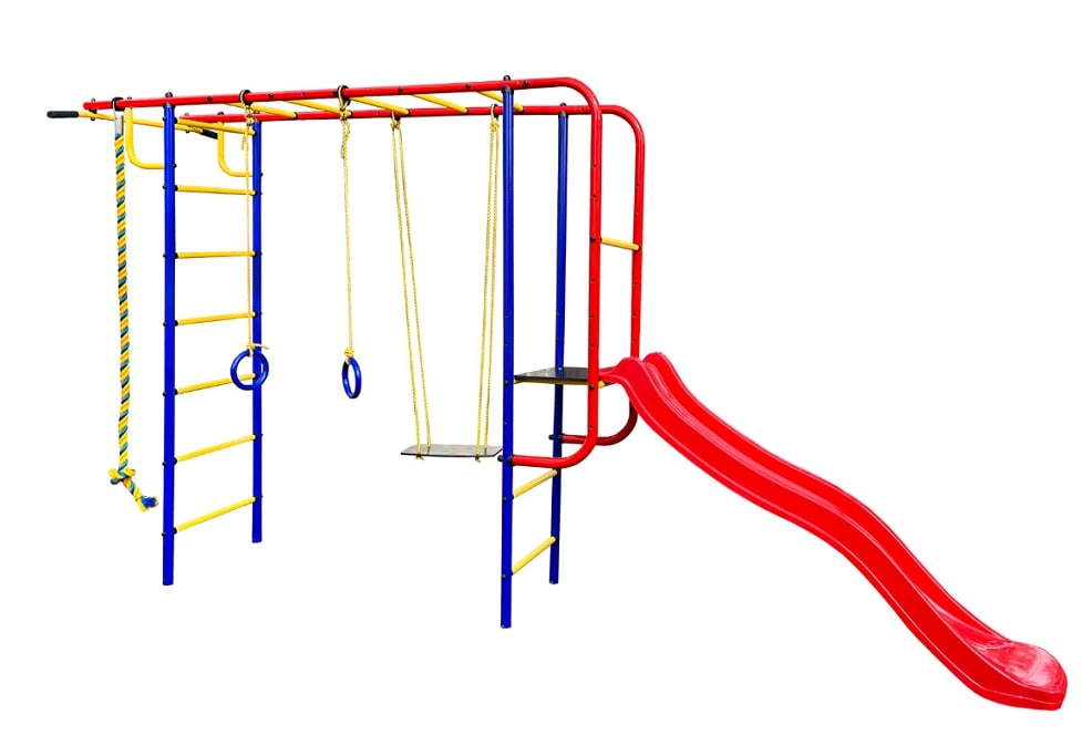 - Допустимая нагрузка на навесное оборудование: канат и кольца- по 100 кг, качели и горка- по 60кг