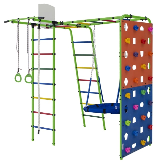 Комплектация: канат, гимнастические кольца, качели-гнездо, баскетбольное кольцо, скалодром.