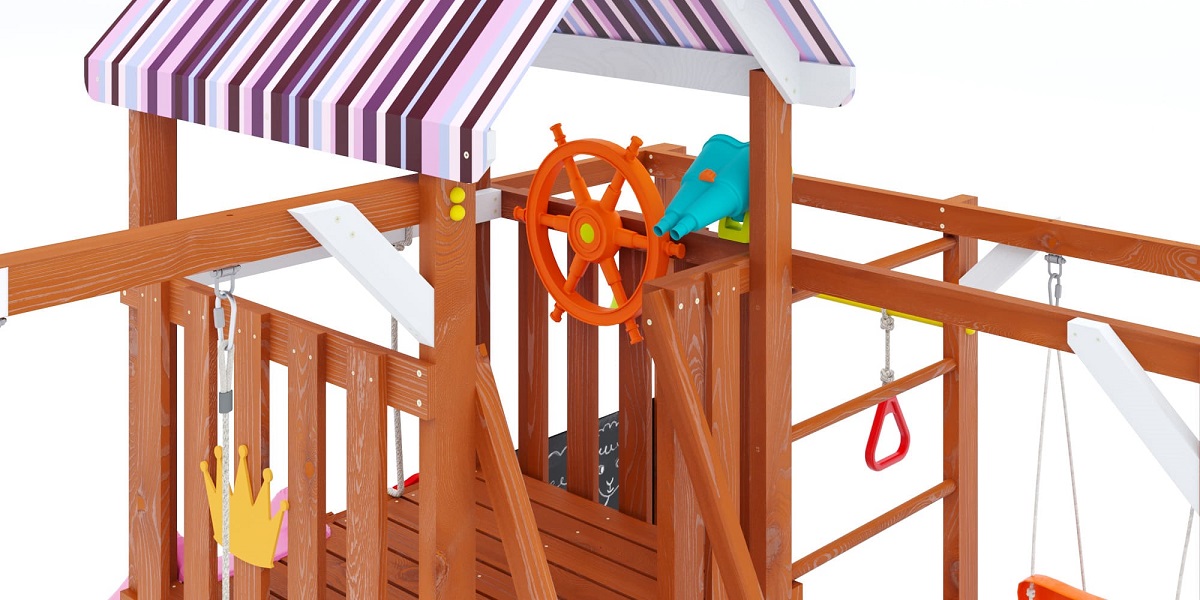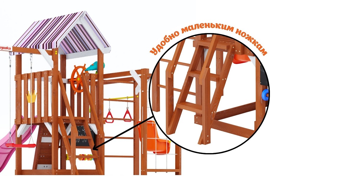 Подходит для установки в частном доме, на даче или во дворе. Благодаря двойной шлифовке и окрашиванию сертифицированными составами, конструкция безопасна даже для самых маленьких.