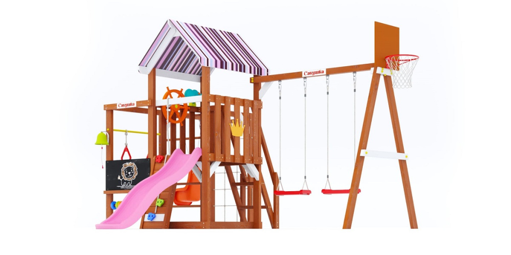цвет крыши и спортивных снарядов может отличаться от представленных на фото (комплектуется производителем из имеющихся на складе)Детская площадка для дачи Савушка TooSun 12 розовый