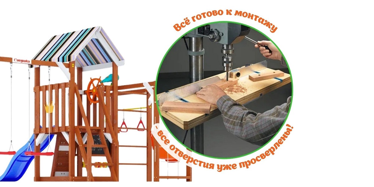 Подходит для установки в частном доме, на даче или во дворе. Благодаря двойной шлифовке и окрашиванию сертифицированными составами, конструкция безопасна даже для самых маленьких.