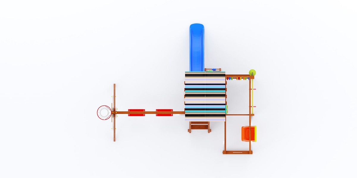 Эта детская площадка сочетает в себе спортивную зону, игровое пространство и обучающие элементы. Шведская стенка, сетка-лазалка, гимнастические кольца, скалодром, турник и качели — всё это формирует уверенность, силу и ловкость.
