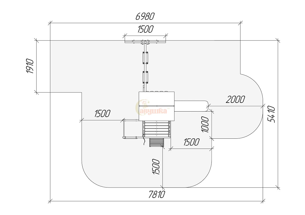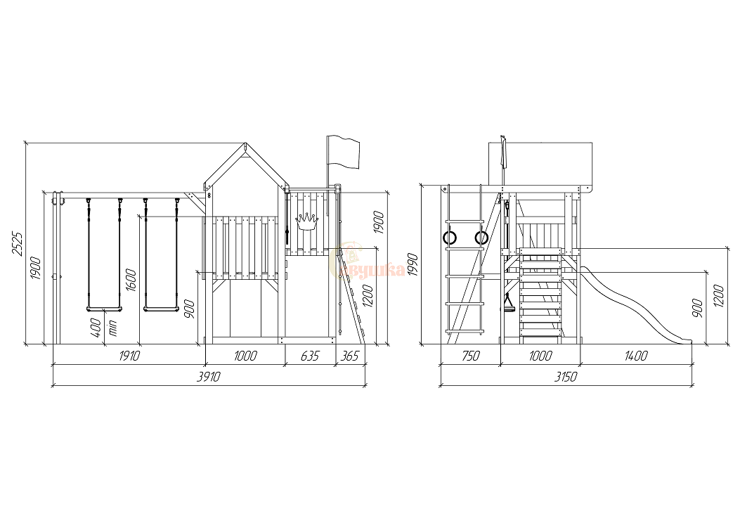 Опорные столбы из материала 45х90, качельная рама: клееный брус 70х70. Модельный ряд имеет множество возможностей по модульной кастомизации(подробности у менеджеров). Можно устанавливать горки разной длины.