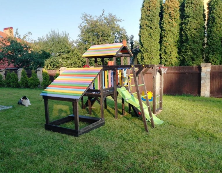 Есть домик с крышей, где дети могут играть, а также пластиковая горка, которая подходит для маленьких деток. Для того чтобы подняться наверх, можно использовать деревянную лесенку с удобными перилами.