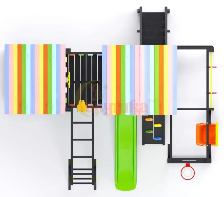 В комплектацию спортивной площадки входит оптимальный набор элементов для интересного и активного досуга деток самого разного возраста: от непременного атрибута всех наших комплексов игровой башни до таких любимых детьми качелей и альпинистской стенки.