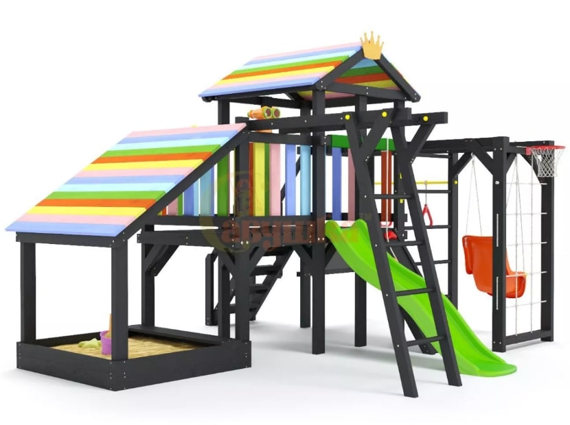 Если у вас есть мяч, то вы можете потренироваться забрасывать его в баскетбольное кольцо – оно тоже включено в комплект этой модели. А после спортивных занятий можно забраться в песочницу под деревянной крышей и заняться возведением песочных замков.