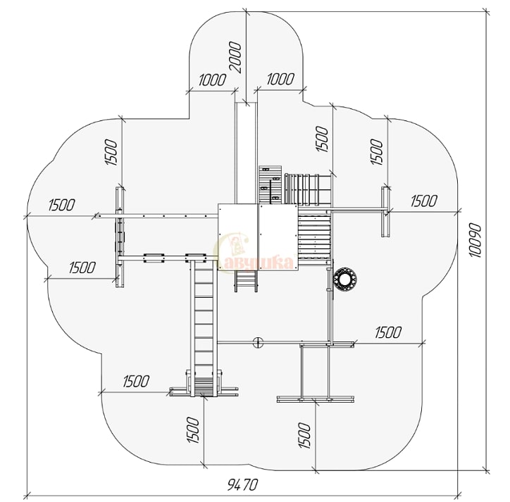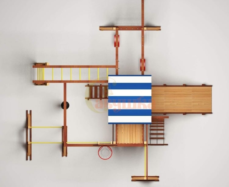 Конструкция всех площадок серии строго соответствует ГОСТ. В качестве основного материала мы используем клееный брус сечением 90х90 мм. Он уникален тем, что не меняет со временем свою геометрию. Для защиты дерева от осадков его покрывают краской на натуральной водной основе, которая безопасна для малышей.