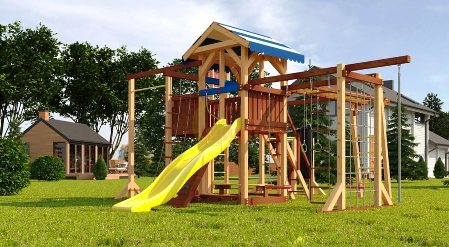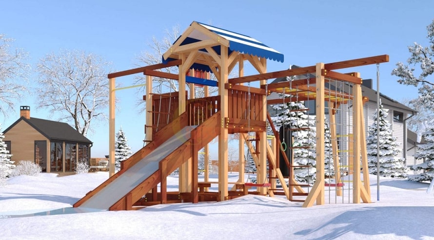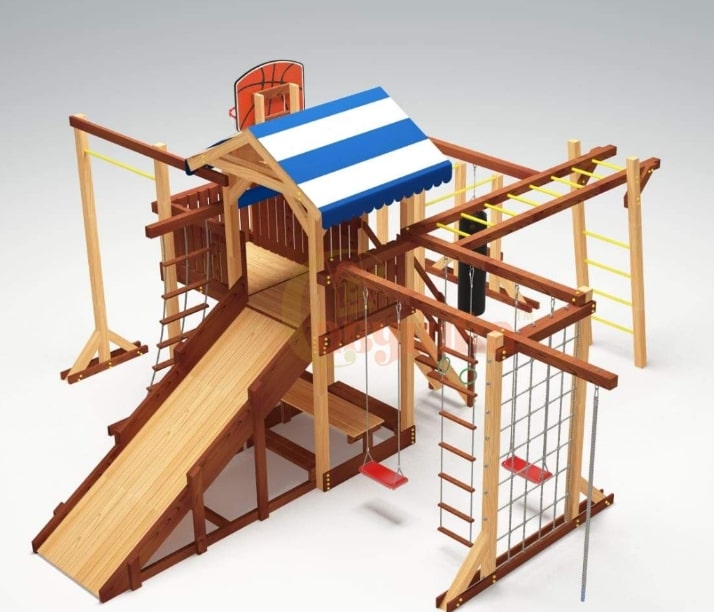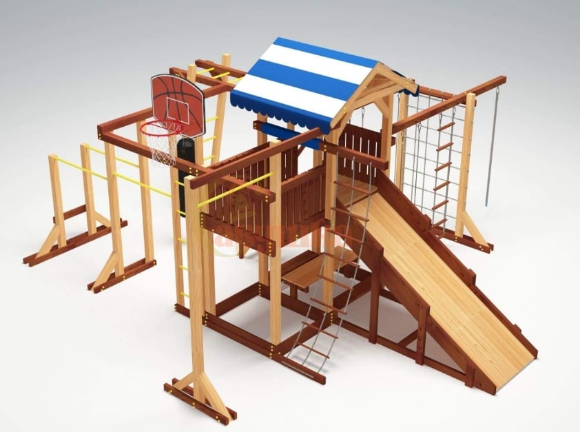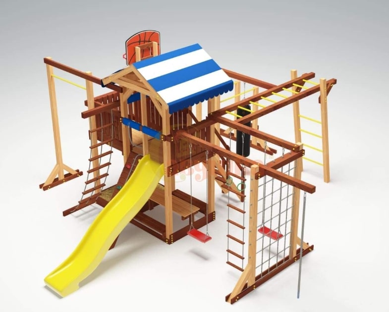 В центре комплекса - игровая башня с яркой двухцветной крышей из материала “Оксфорд”. Чтобы подняться в нее, нужно преодолеть сетку-лазалку, скалодром или лестницу-трап с узкими ступенями. Такие ежедневные мини-тренировки развивают у детей чувство равновесия, учат преодолевать страх и нерешительность. Спуститься вниз можно теми же путями, а также самым интересным и веселым - съехать по трехметровой горке. В зимний период горка может быть заменена на деревянный скат (поставляется в комплекте). Ширина ската 93 см позволяет кататься с него на ледянках и тюбингах.