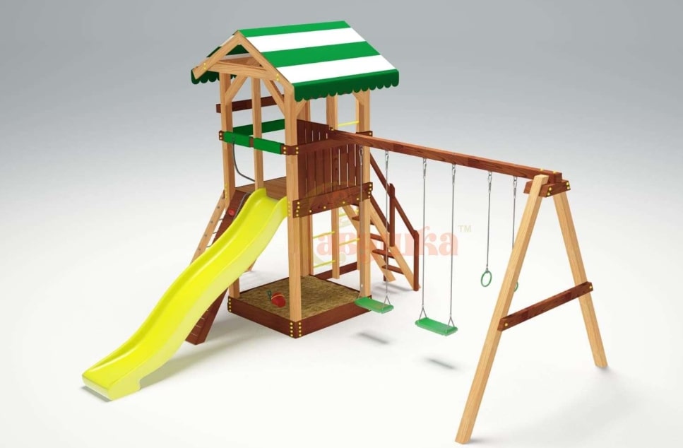 Детская игровая площадка Савушка 4 Cезона предназначена для детей от 3 лет. В центре конструкции башня с игровыми и спортивными элементами высотой платформы 1,5 м. Она покрыта ярким полосатым навесом. Под башней оборудована песочница для спокойных игр, а рядом – две пары качелей. Это лучший вариант, если в семье двое детей – тогда споров из-за качелей не возникнет. Качаться вдвоем всегда веселее – современные дети точно оценят это преимущество. Активные малыши точно оценят наличие гимнастических колец. Занятия на них помогут развить силу и выносливость. Крыша домика выполнена из дерева и украшена яркими разноцветными полосами. Она защитит детей во время игры от осадков и ярких солнечных лучей.
