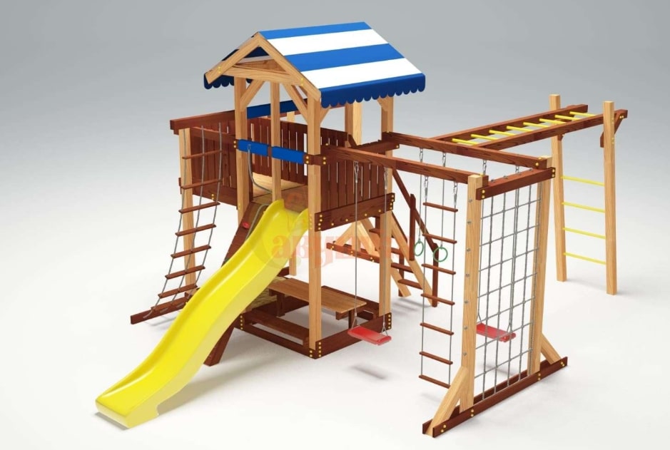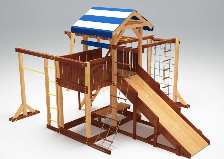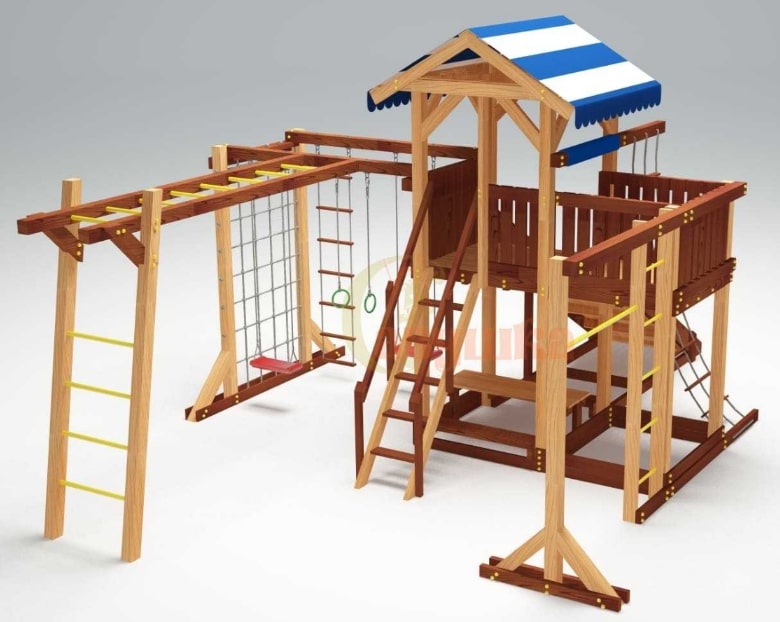 Конструкция всех площадок серии строго соответствует ГОСТ. В качестве основного материала мы используем клееный брус сечением 90х90 мм. Он уникален тем, что не меняет со временем свою геометрию. Для защиты дерева от осадков его покрывают краской на натуральной водной основе, которая безопасна для малышей.