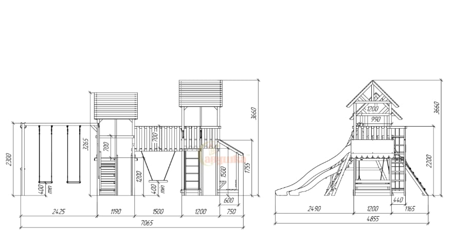Горка, Домик (замок), Качели, Скалодром, Канат |