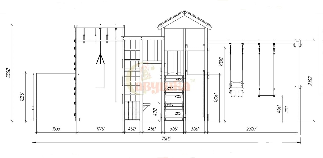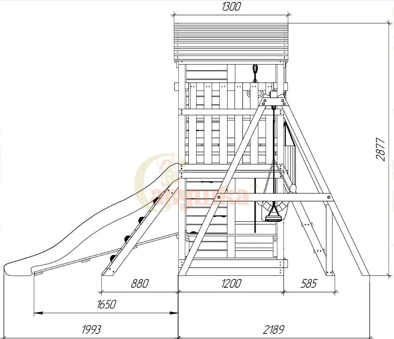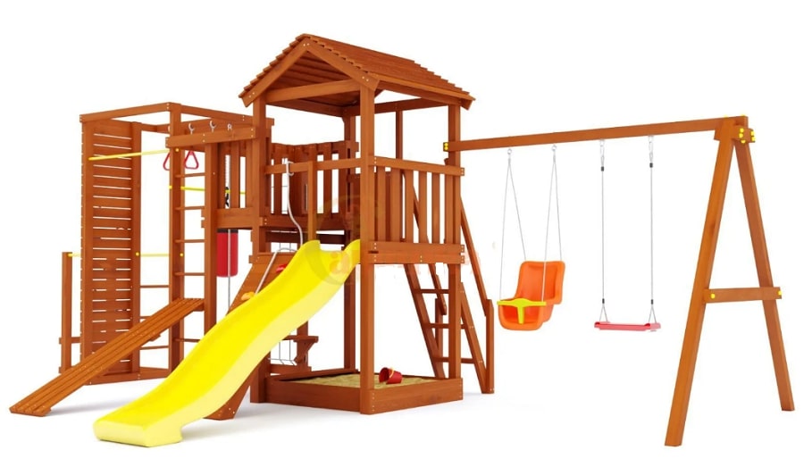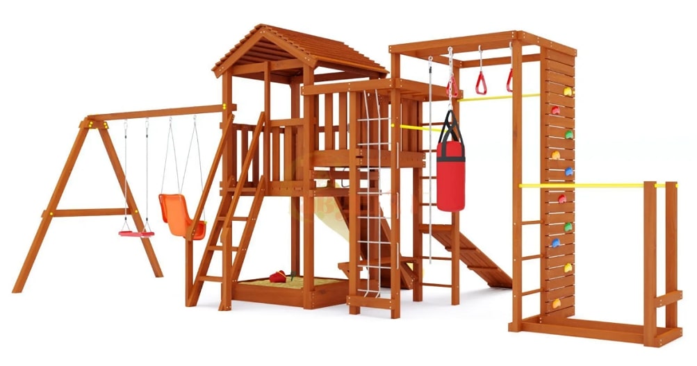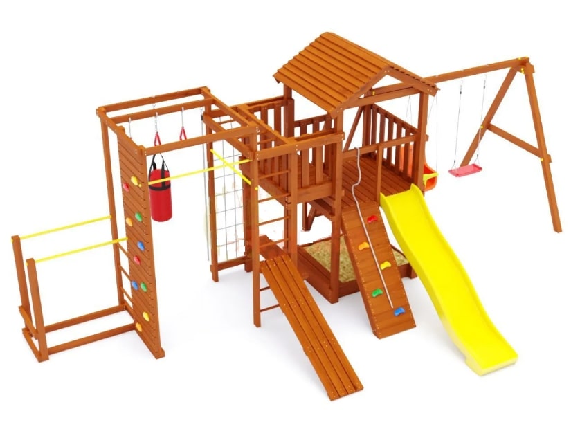 Горка, Домик (замок), Качели, Скалодром, Канат |