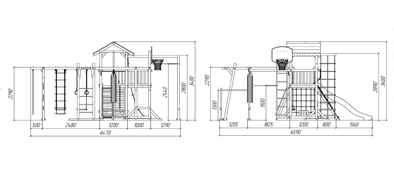 Горка, Домик (замок), Качели, Скалодром, Канат, Кольца |