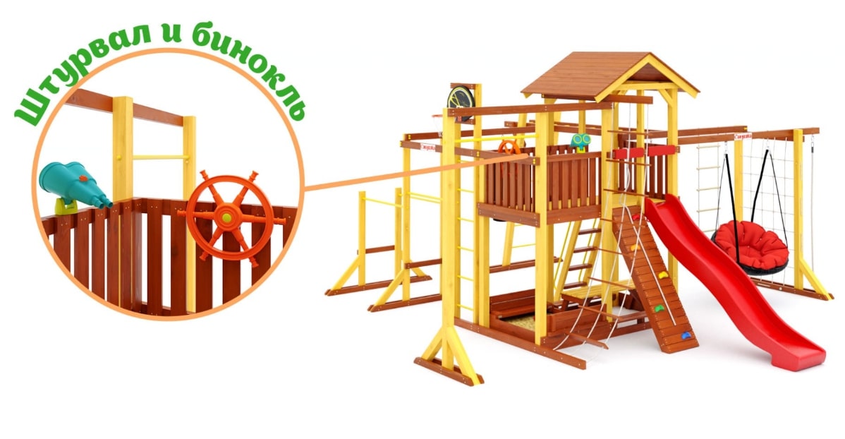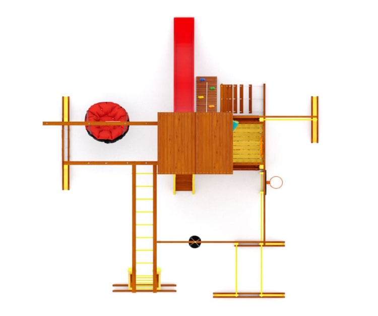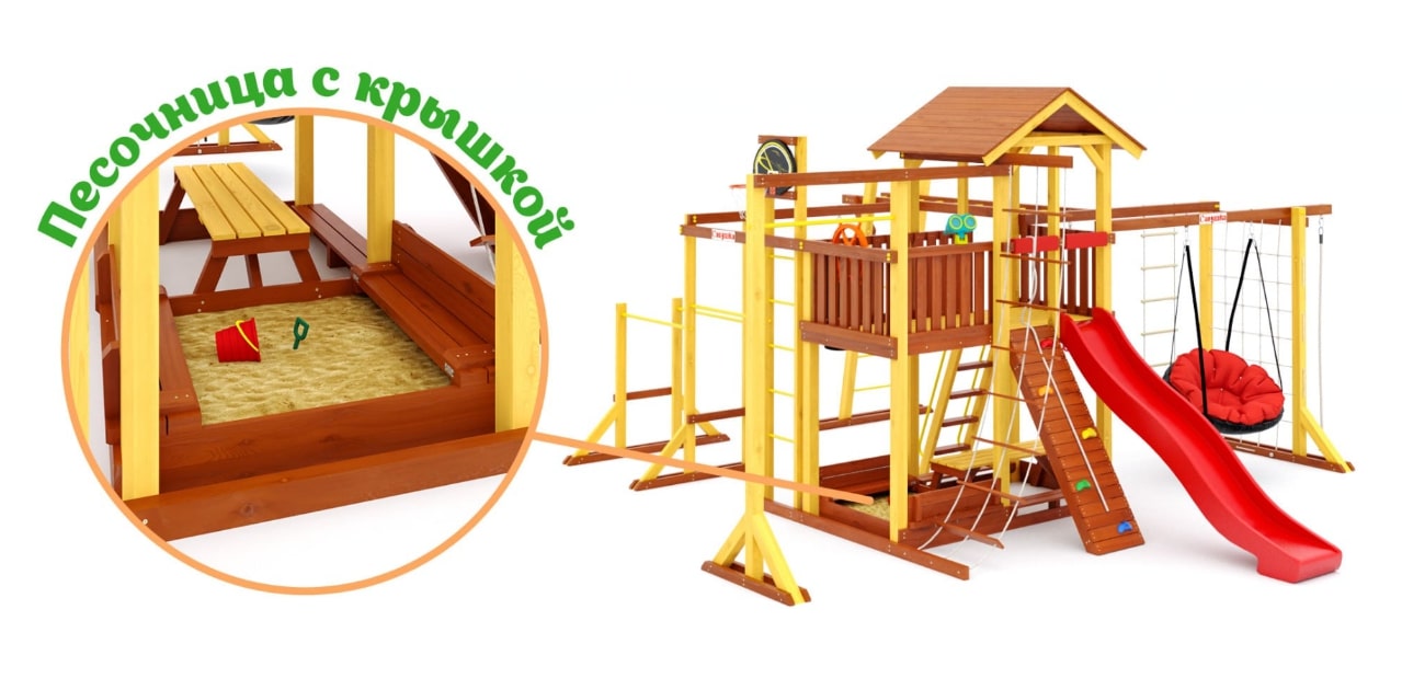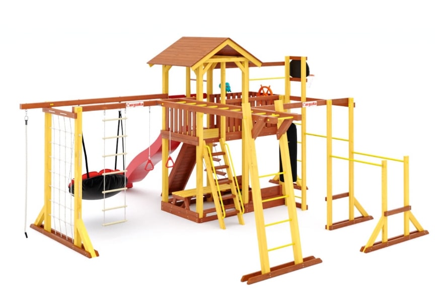 - Многообразие игровых элементов: В комплектацию входят скалодром, сетка-лазалка, турники, гимнастические кольца, песочница с крышкой, которая трансформируется в две лавочки, и многое другое.