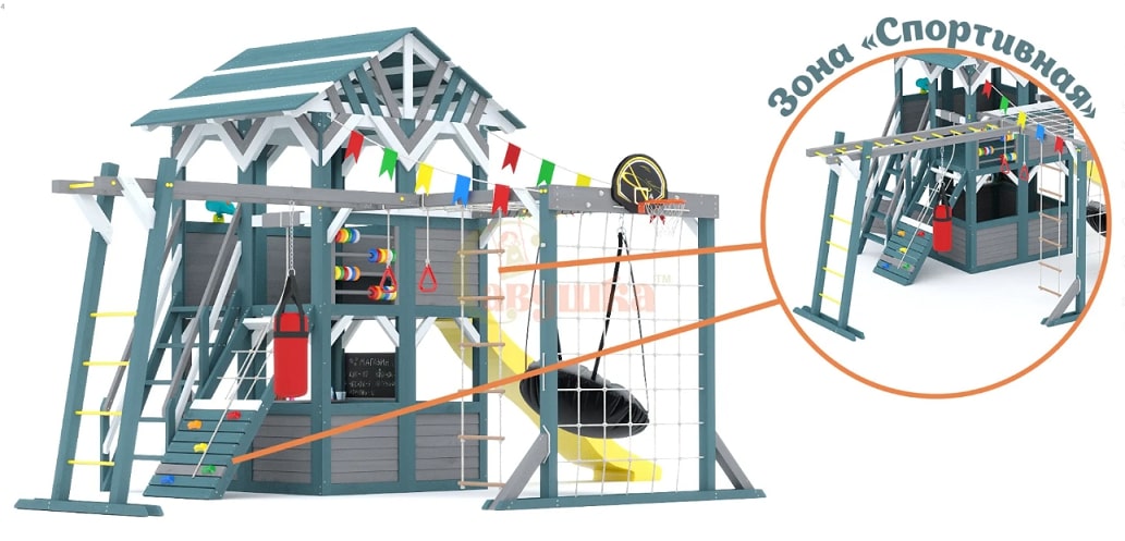 Множество лазательных и спортивных элементов, широкие возможности для тематических игр.