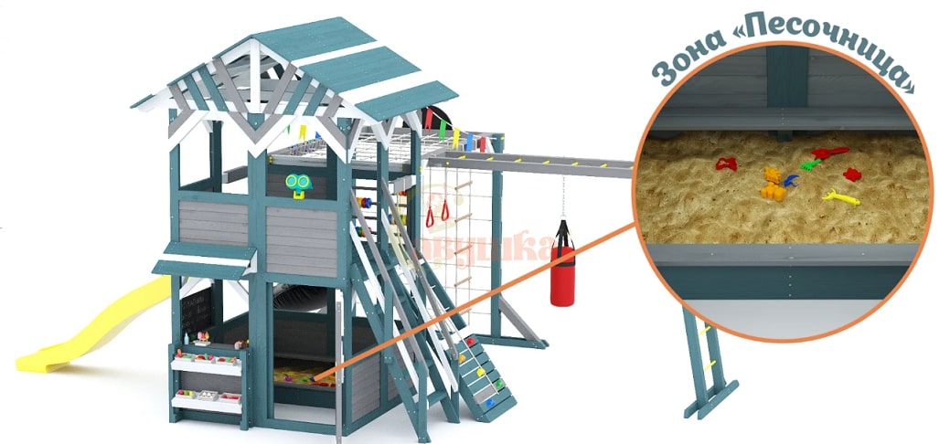 - Множество лазательных и спортивных элементов, широкие возможности для тематических игр.