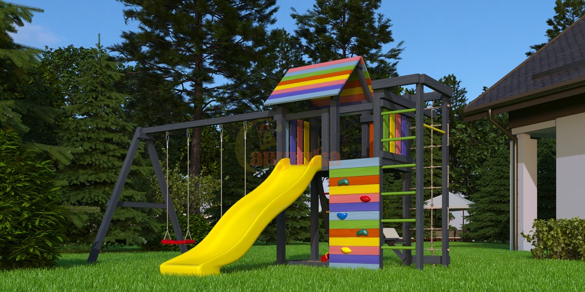 Горка, Домик (замок), Качели, Скалодром, Канат |