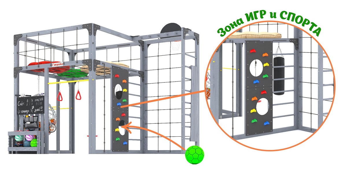 - Развитие и спорт: шведская стенка, скалодром, силовой фристайл-рукоход, кольца и турник — для формирования силы, ловкости и выносливости