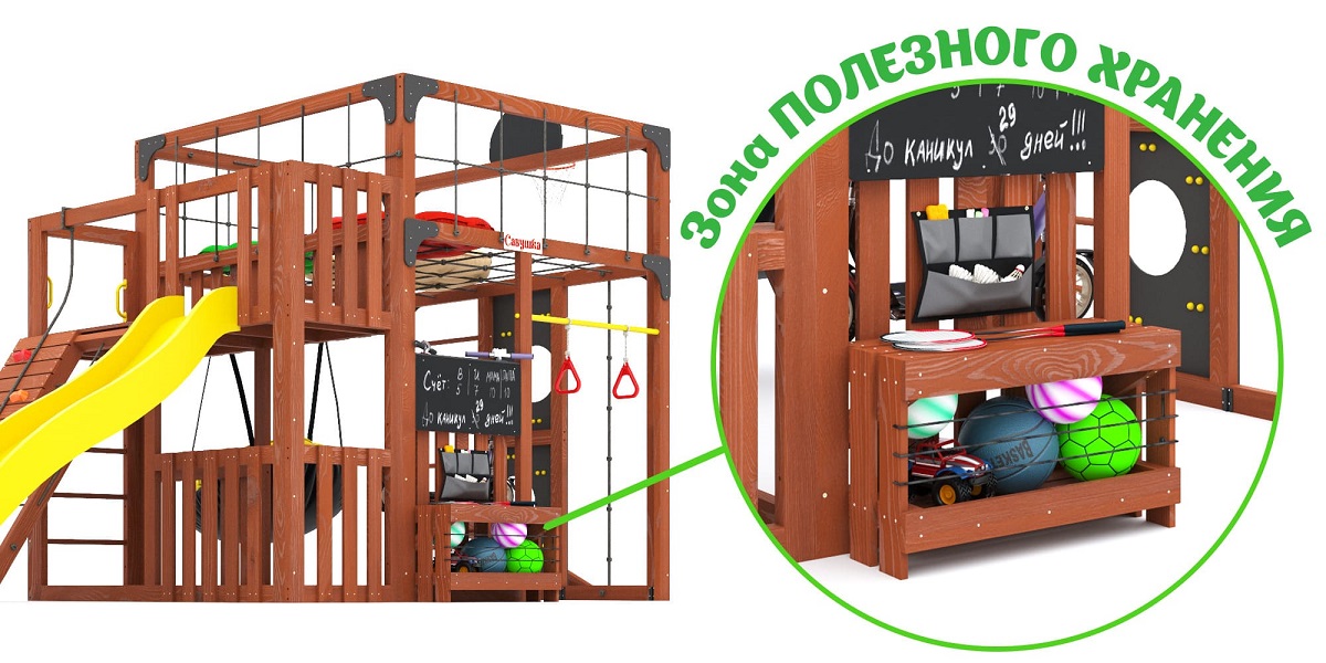 - Игровые зоны: верхний и нижний уровни «ПандаПарк», меловая доска, зоны хранения мячей и самокатов, органайзеры для игрушек.