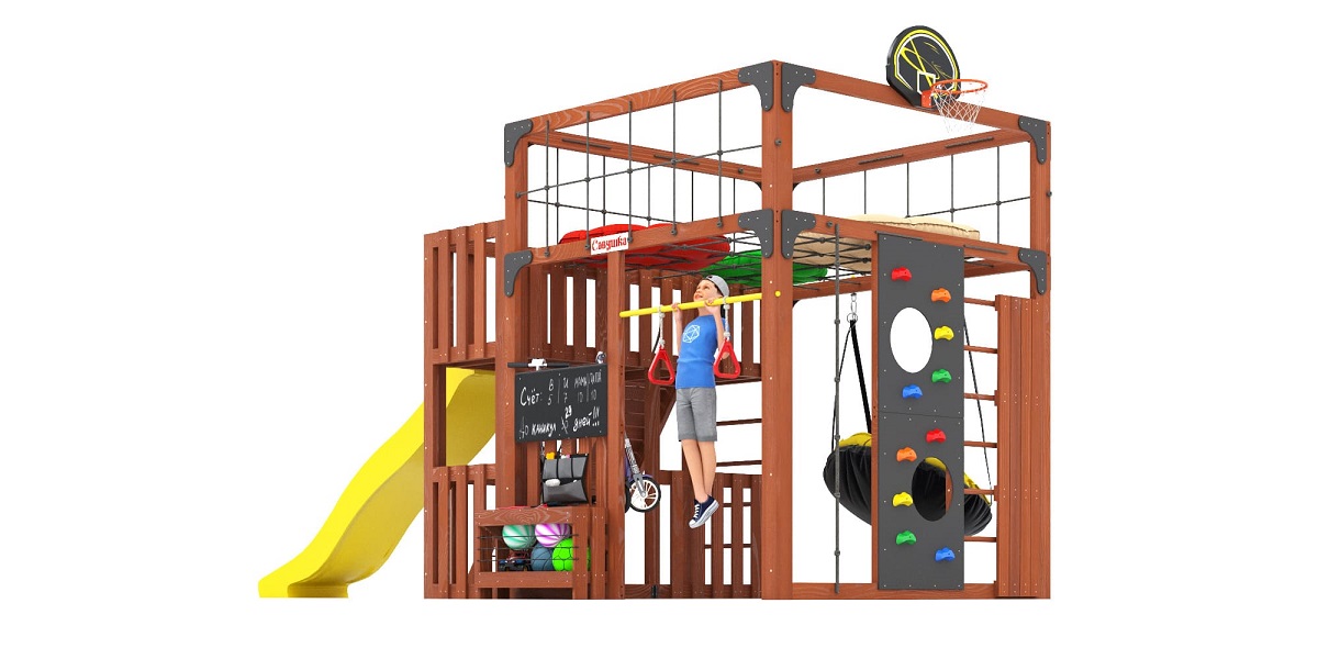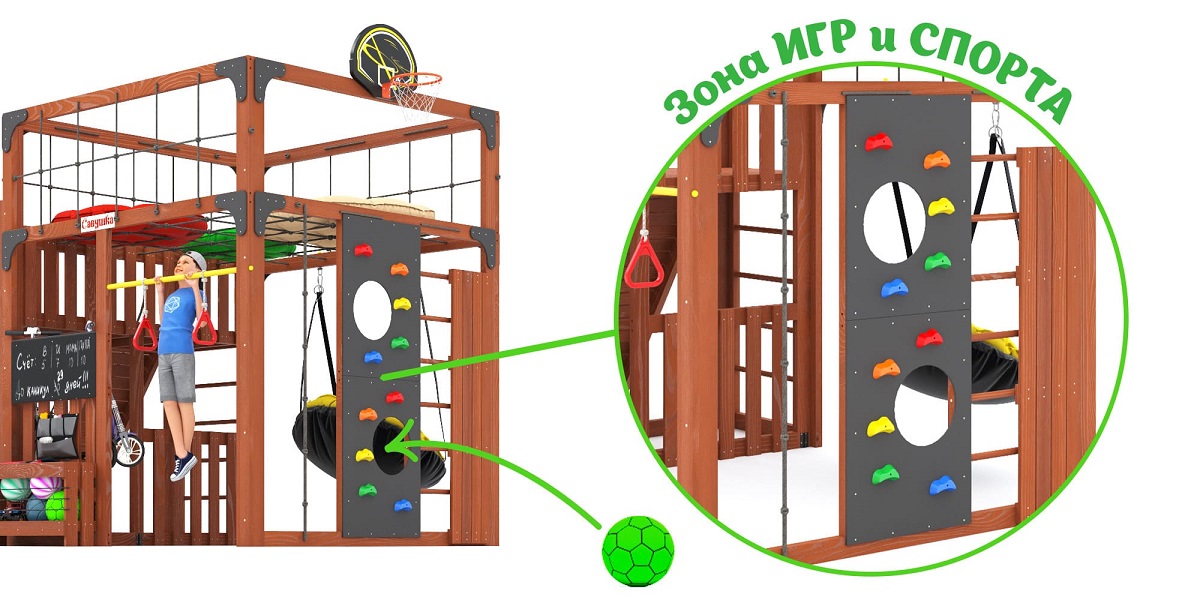 - Спорт и развитие: шведская стенка, скалодром, турник, баскетбольный щит, кольца, канат, горка — для формирования силы, ловкости и выносливости.