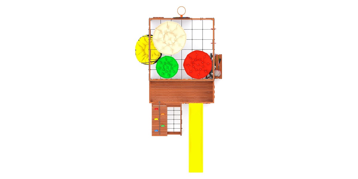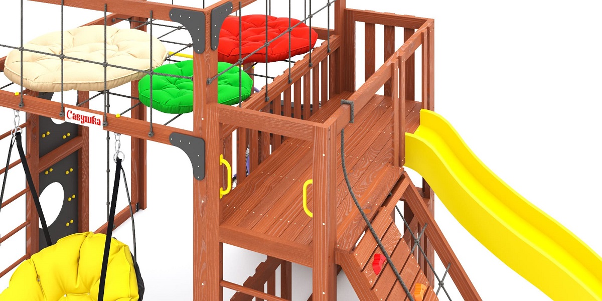 Зона отдыха и релакса: мягкие подушки на верхнем уровне и подвесное кресло «PapaSAV» — место для отдыха, общения и расслабления после активных игр.