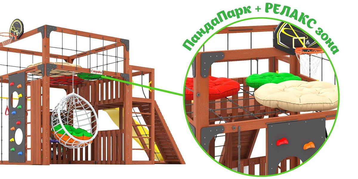 Зона отдыха и релакса: мягкие подушки на верхнем уровне и качели Кокон — место для отдыха, общения и расслабления после активных игр.