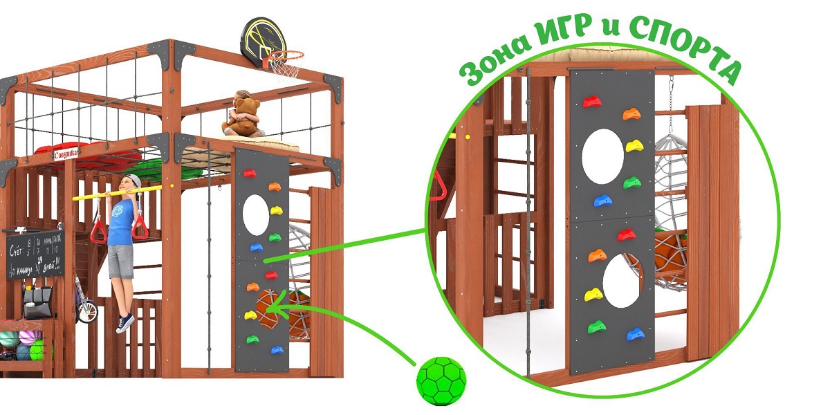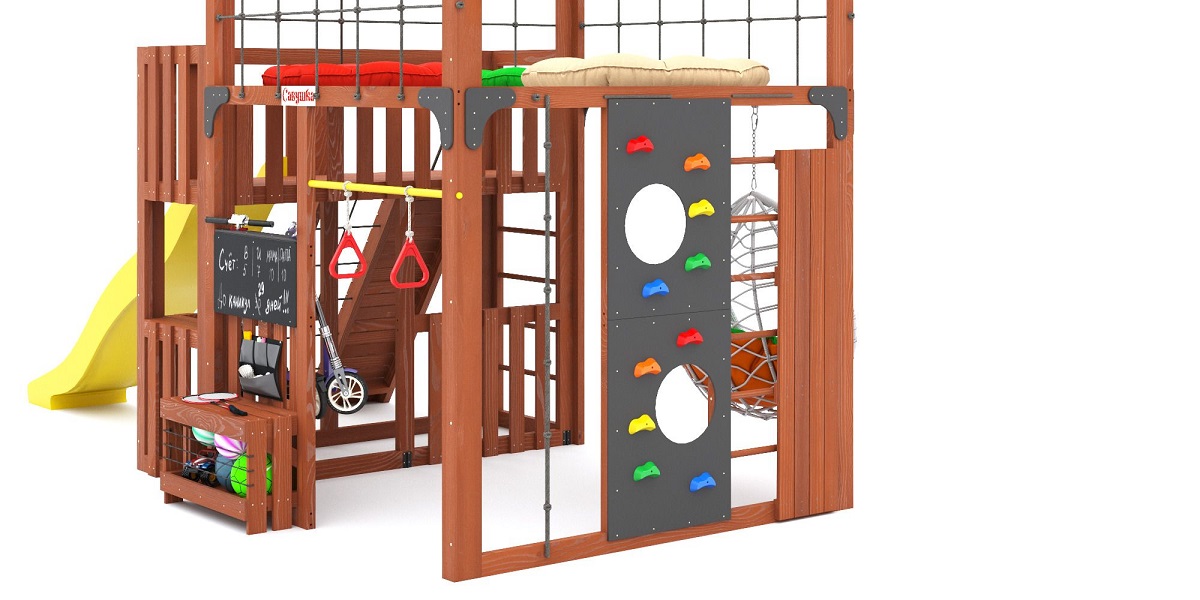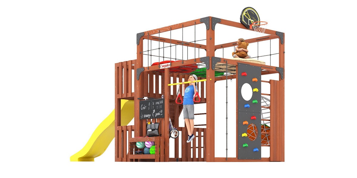 - Спорт и развитие: шведская стенка, скалодром, турник, баскетбольный щит, кольца, канат, горка — для формирования силы, ловкости и выносливости.