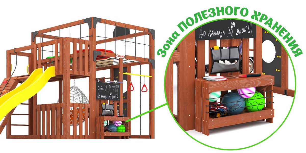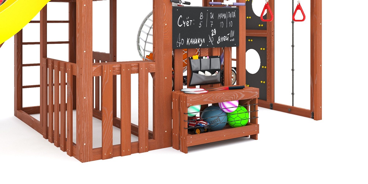 - Игровые зоны: верхний и нижний уровни «ПандаПарк», меловая доска, зоны хранения мячей и самокатов, органайзеры для игрушек.