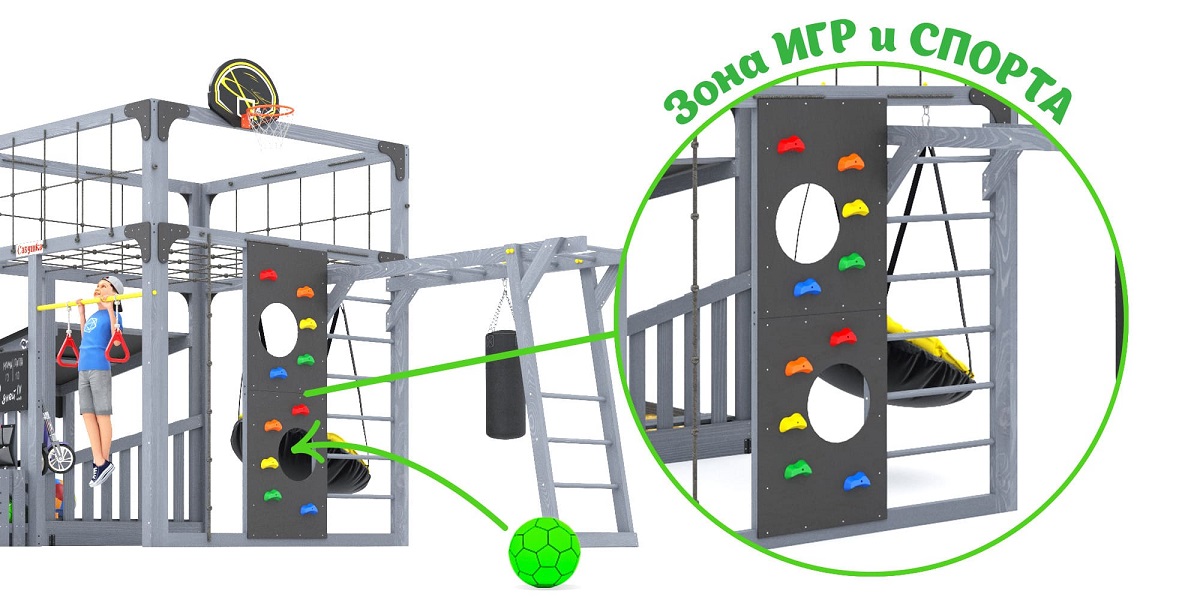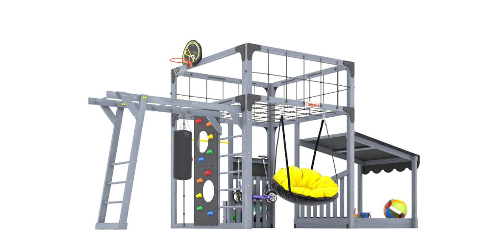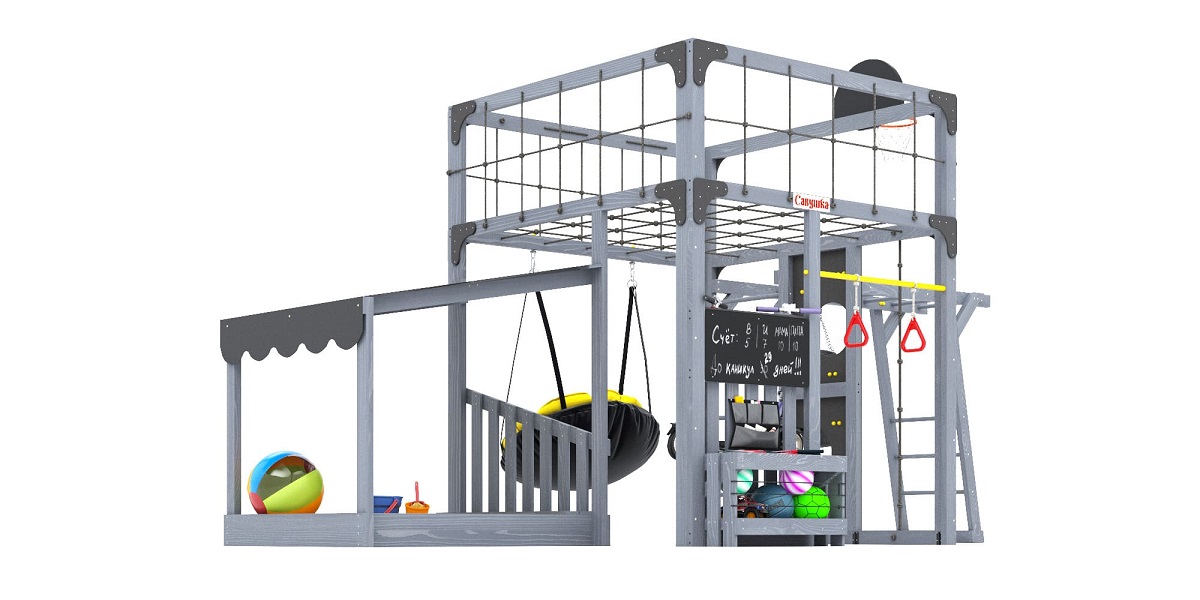 Это — площадка нового уровня с функциональными зонами для активных игр, отдыха и удобства.Габариты: ДхШхВ 5945 х 3040 х 3015 мм